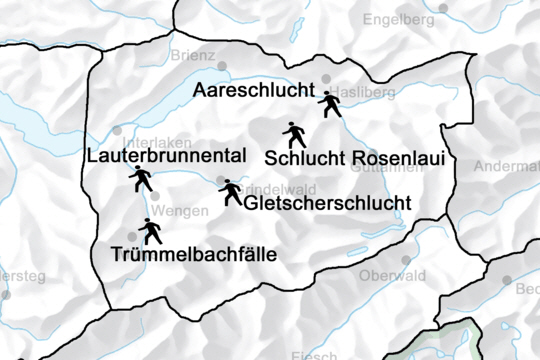 the places to visit in the Region Jungfrau guide you through valley and gorges with a lot of waterfalls showing the power of the water in the mountains.