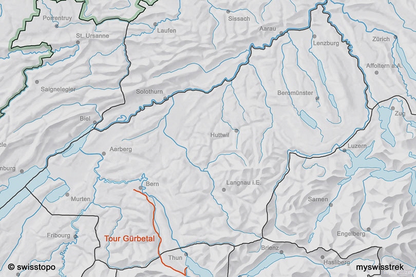 Bei Gwatstutz verlassen wir den Thunersee und gelangen über einen kleinen Pass ins Gürbetal. Auf der westlichen Anhöhe mit bestem Blick auf das liebliche Tal fahren wir über Belp nach Bern.